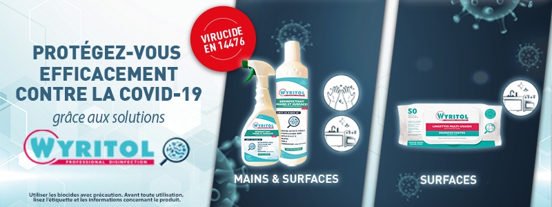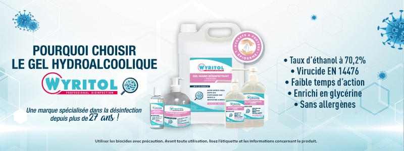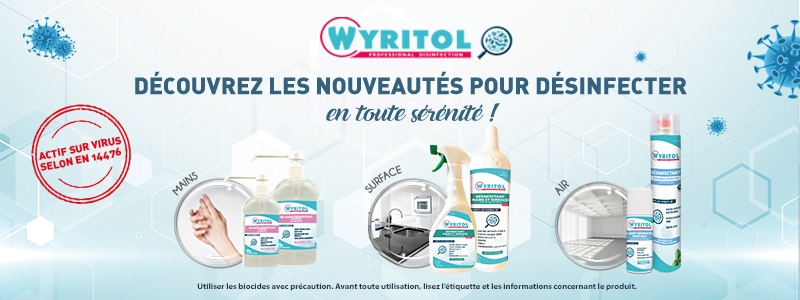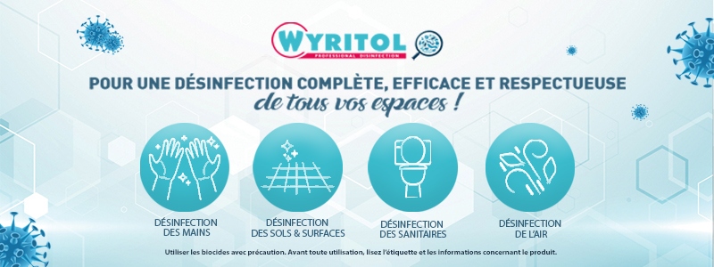 Experte de la désinfection depuis presque 30 ans Wyritol offre un large choix de produits afin de répondre aux problématiques de nettoyage et de désinfection en entreprise avec des formats adaptés. Wyritol vous propose des produits aux formules professionnelles, à large spectre de désinfection (virucide, bactéricide, levuricide et fongicide), vous permettant ainsi de lutter efficacement contre tous risques microbiologiques. Vous pourrez donc travailler sereinement dans un environnement propre et sain ! WYRITOL a également la volonté de développer des formules plus respectueuses dans le but de respecter la santé de ses usagers et l’environnement.